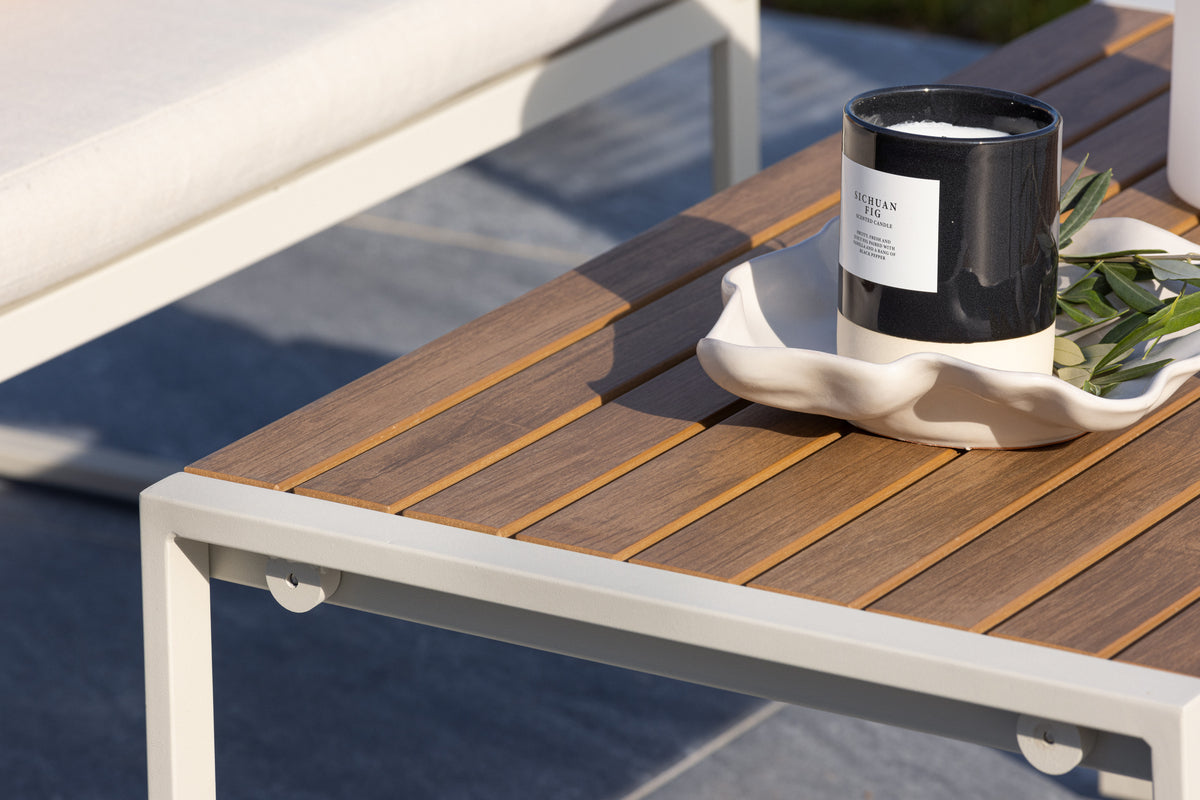 Med Dallas soffgrupp kan du bjuda in dina nära och kära för avkopplande stunder och underhållande utomhus. Dallas soffgrupp har en ren vit färg och är tillverkad av stål, vilket garanterar hållbarhet och motståndskraft mot väder och vind. Bordet är försedd med en vacker bordsskiva i trä, vilket ger en naturlig känsla. Skapa en avslappnad och inbjudande atmosfär på din terrass, altan eller trädgård med Dallas soffgrupp.