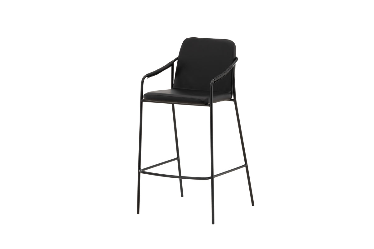 En modern barstol från serien TVIST som passar utmärkt i det moderna hemmet! Den här barstolen har en stoppad sits och helklädd design i svart PU med minimalistiska stolsben samt integrerade armstöd i svart stål.