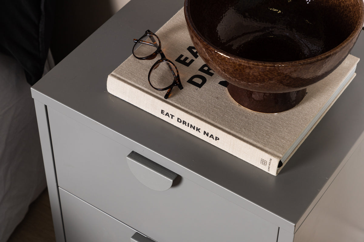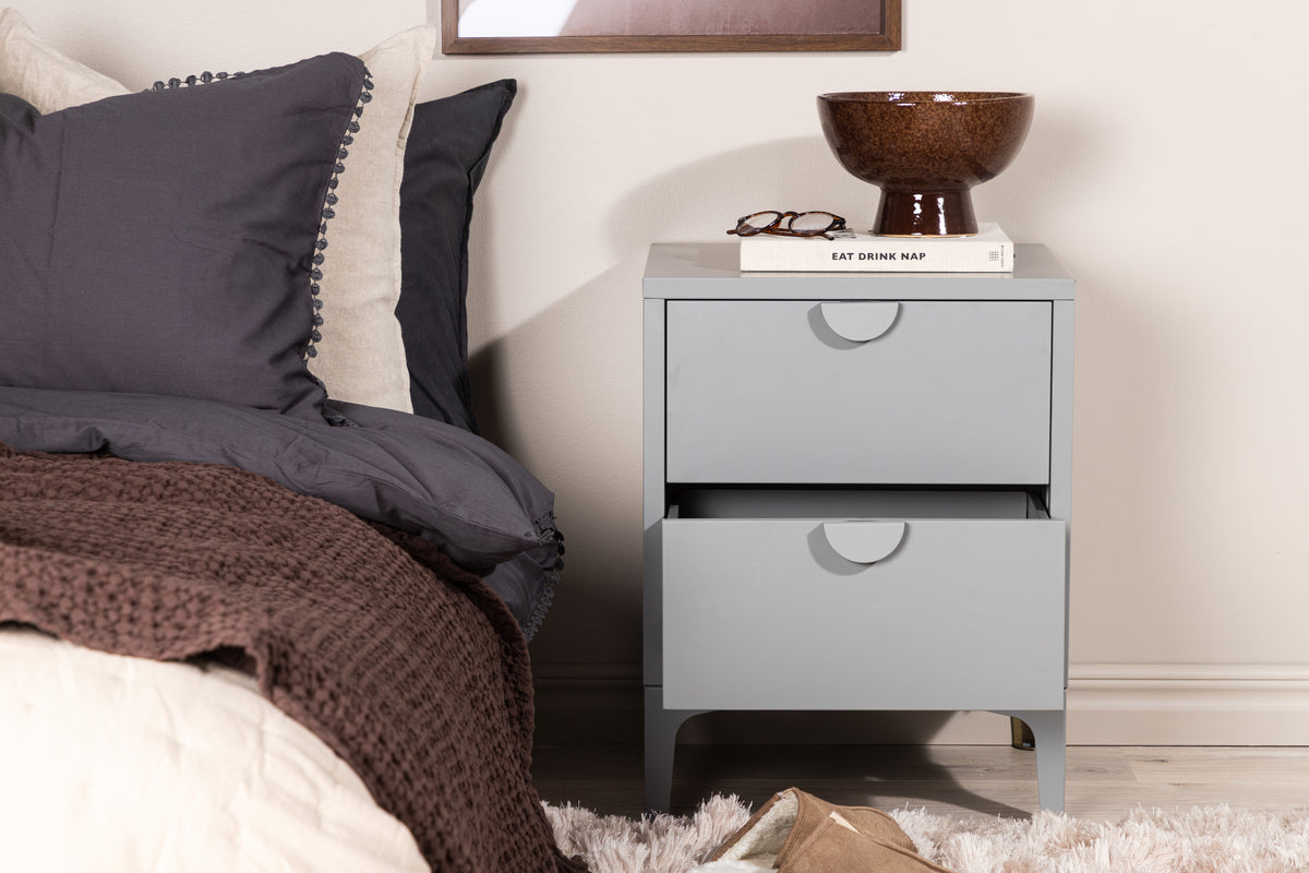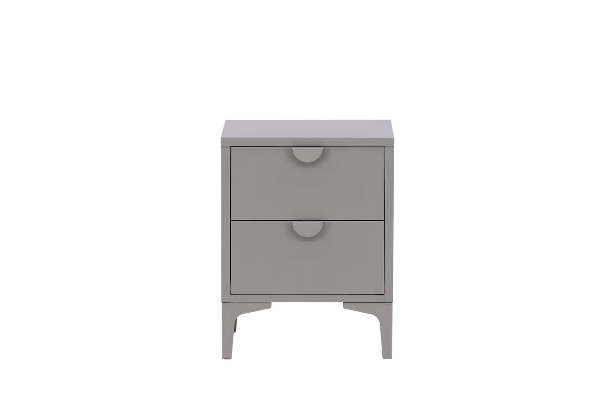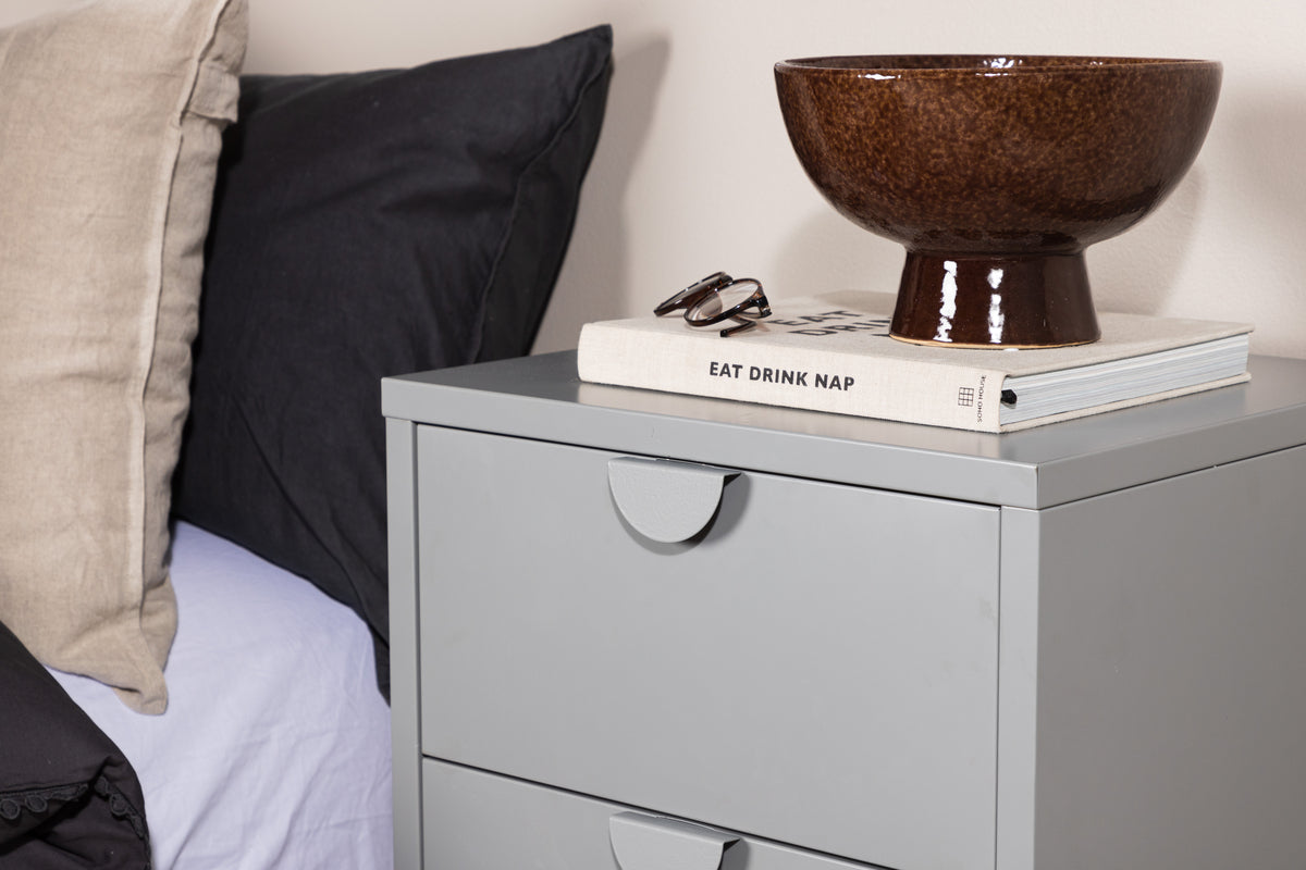 Sängbord i serien Piring är perfekt som förvaringslösning! Det kvadratiska sidobordet i grått stål har två lådor för dold förvaring och stilren ovansida med lagom plats för en sänglampa, en bra bok och eventuell prydlig inredningsdetalj för modern look.