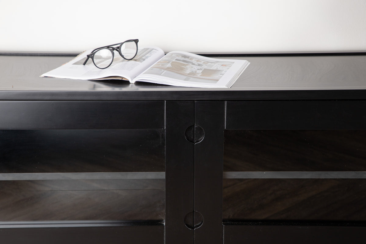 Den här byrån är tillverkad i svart MDF med två högerjusterade skåp och två vänsterjusterade lådor. Skåpen har två hyllplan som möjliggör synlig förvaring. Skänken lyfts upp av fyra ben som gör det enkelt att dammsuga undertill. Möblera ditt hem smart och trendsäkert!