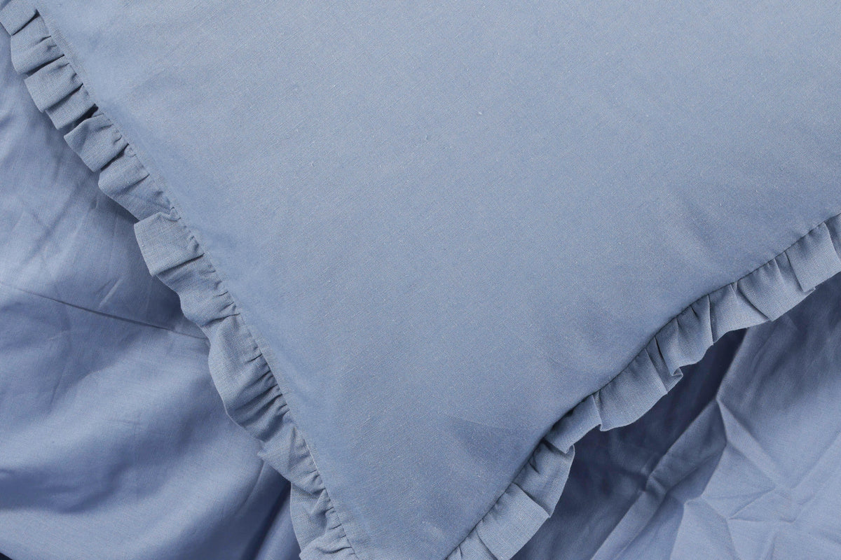 Bädda din säng charmigt med ett smickrade påslakanset från serien Lias! Det här mjuka bäddsetet i bommullsväv och linne har en smakfull blå kulör och försluts med knappar nertill. Tyget har en vacker volangkant runt alla kanter som bidrar till det mysiga blickfånget.
