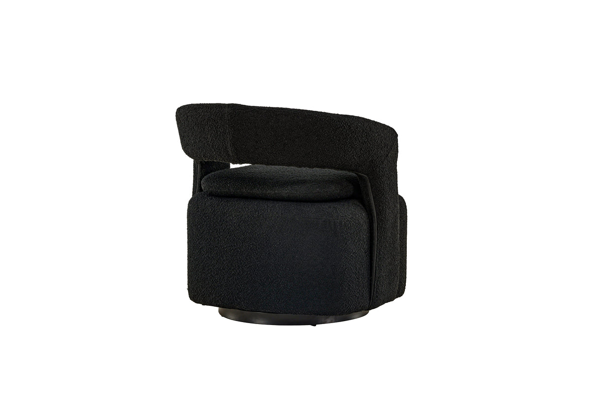 Designen är golvnära, vilket ger ett robust intryck och sitsen har en extra kudde som ger ett schysst lyft som är lika snyggt som bekvämt. Det öppna ryggslutet bidrar också till en mer modern utformning som imponerar. Fåtöljen är helklädd i svart boucletyg som bidrar till att den här fåtöljen klättrar på trendlistorna.