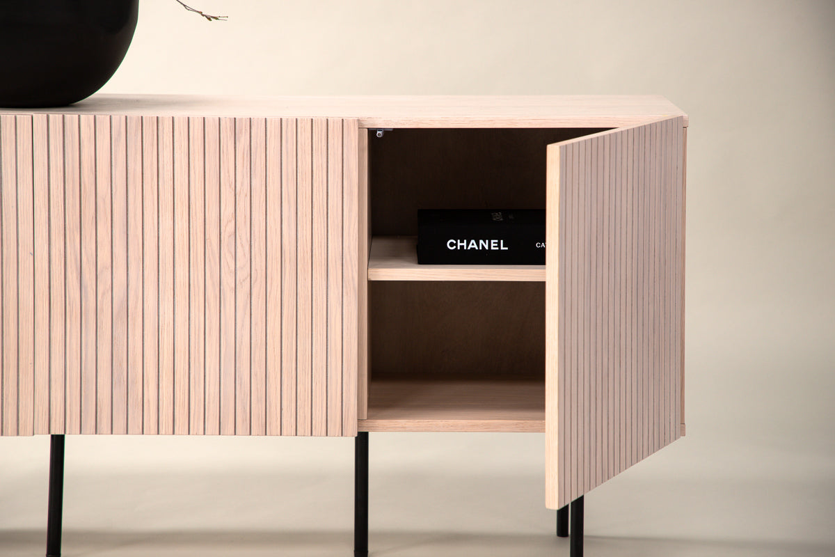 Avlastningsskåpet i Skandinavisk design som klättrar på trendlistorna med sin stilsäkra utformning! Skåpet tillhör serien Björkön och kommer i olika kulörer och storlekar. Det här avlastninsgskåpet har tre luckor i ribbad design med två hyllplan som möjliggör dold förvaring.