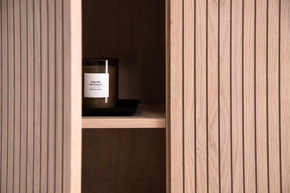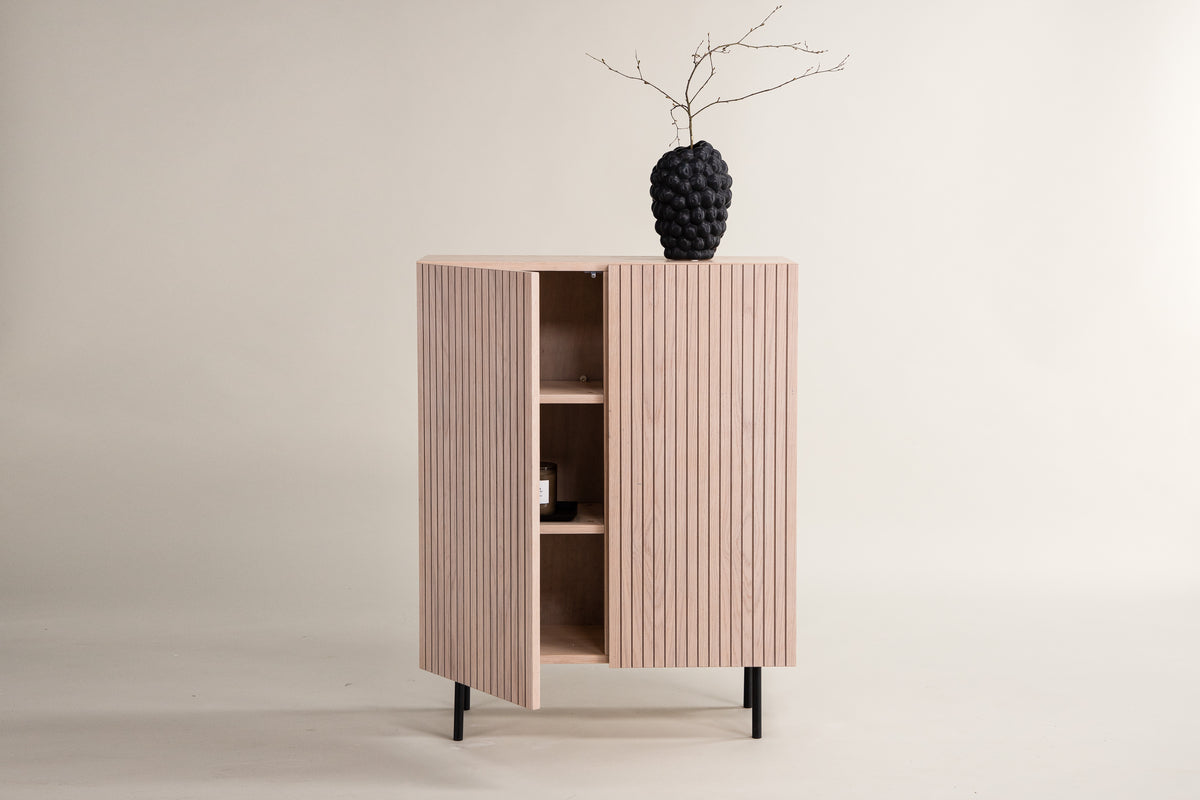 Skåpet har två luckor i ribbad look och tre hyllplan för dold förvaring. Tillverkat i vitputsade faner och lyfts upp av smal ben i svart stål. Placera som sidobord med vackra dekorationer och ljusstakar eller som dolt vitrinskåp - bara fantasin sätter gränser!