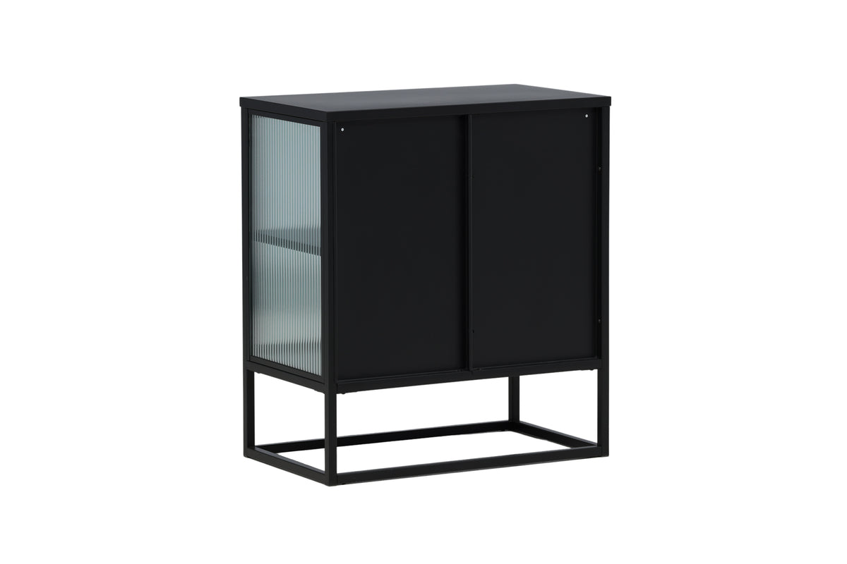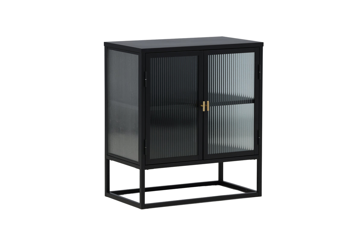 Välkommen till en värld av sofistikerad förvaring med vårt trendsäkra förvaringsskåp från serien Garis. Detta svarta skåp med glasdörrar i skandinavisk design kombinerar estetik med funktion. De två glasdörrarna har en veckad design och skåpet ramas in av en stilren ram i svart pulverlackerat metall, vilket gör detta skåp till en tidlös investering i din inredning.