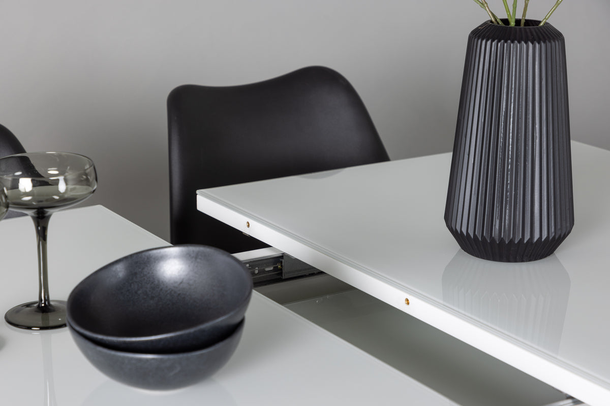 Möblera hemmets hjärta stilrent i tidlösa kulörer med en matgrupp som är förlängningsbar vid behov. Här får du allt du behöver både till vardags och till fest! Detta förlängningsbara matbord från serien Pluto har en trendig design och hållbar kvalitet. Bordsskivan är i vit MDF med en glasskiva ovanpå som blir en snygg detalj. Bordets förlängningsbara funktion gör det enkelt att rymma både små och stora sällskap, vilket gör detta bord till en perfekt investering för alla slags tillfällen.