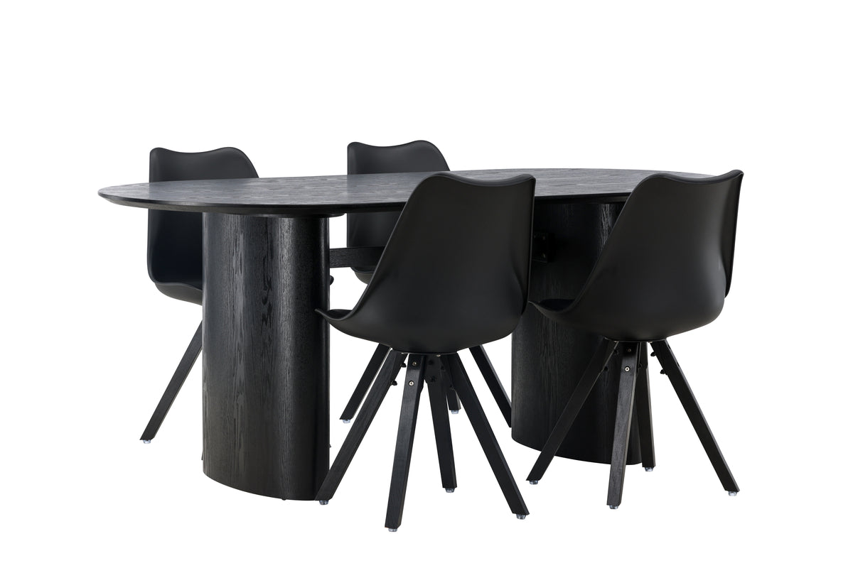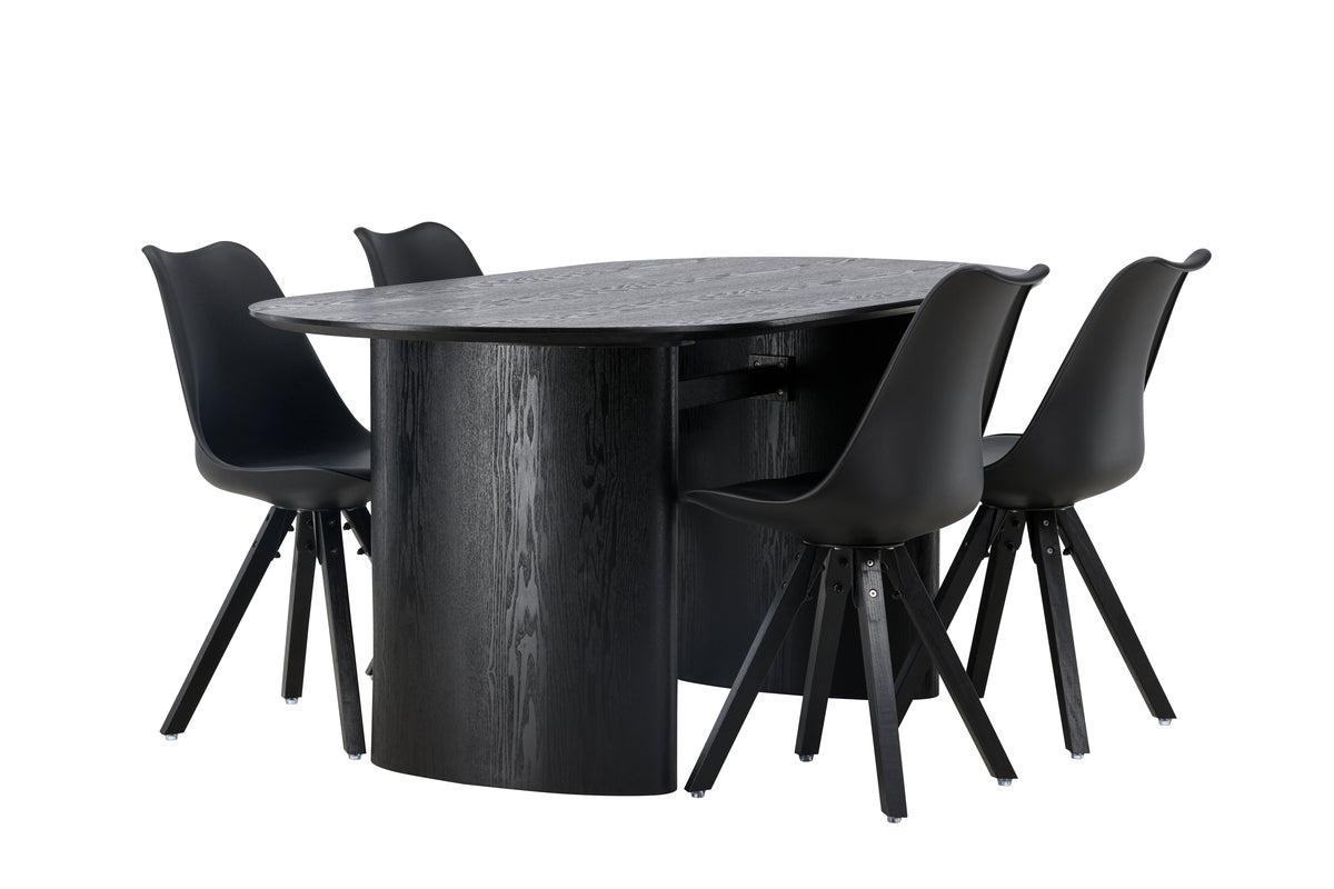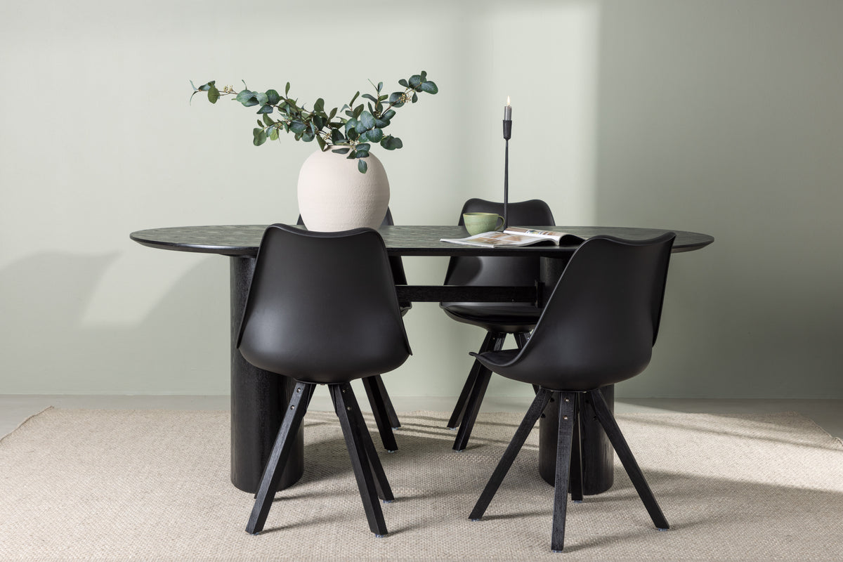 Lika praktisk som snygg! Det ovala matbordet Isolde i svart kulör har en modern utformning med en oval bordskiva i MDF och robust stomme som ger ett stadigt intryck. Det levande materialet ger smakfull rörelse till blickfånget. Här i snygg kombination med hållbara matstolar från serien Zeno. Stolen har en inbjudande utformning med rygg och sits i svart plast, inbyggd sittdyna med hög komfort och fyra utsvängda ben i svart trä. Få det bästa av två världar!