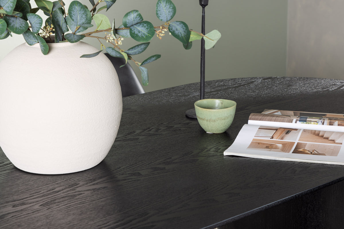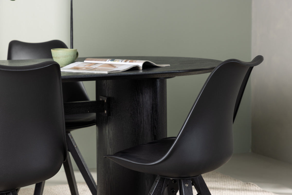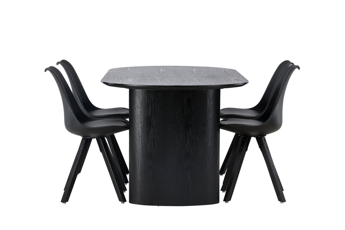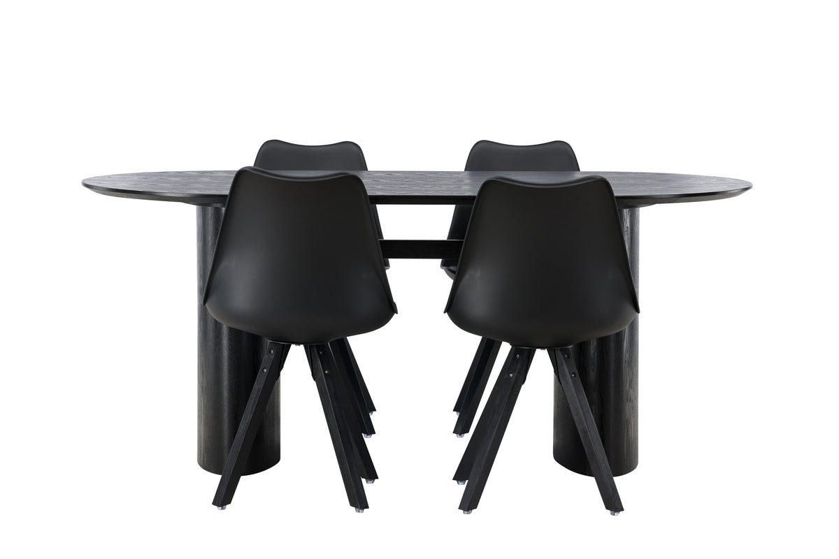 Lika praktisk som snygg! Det ovala matbordet Isolde i svart kulör har en modern utformning med en oval bordskiva i MDF och robust stomme som ger ett stadigt intryck. Det levande materialet ger smakfull rörelse till blickfånget. Här i snygg kombination med hållbara matstolar från serien Zeno. Stolen har en inbjudande utformning med rygg och sits i svart plast, inbyggd sittdyna med hög komfort och fyra utsvängda ben i svart trä. Få det bästa av två världar!