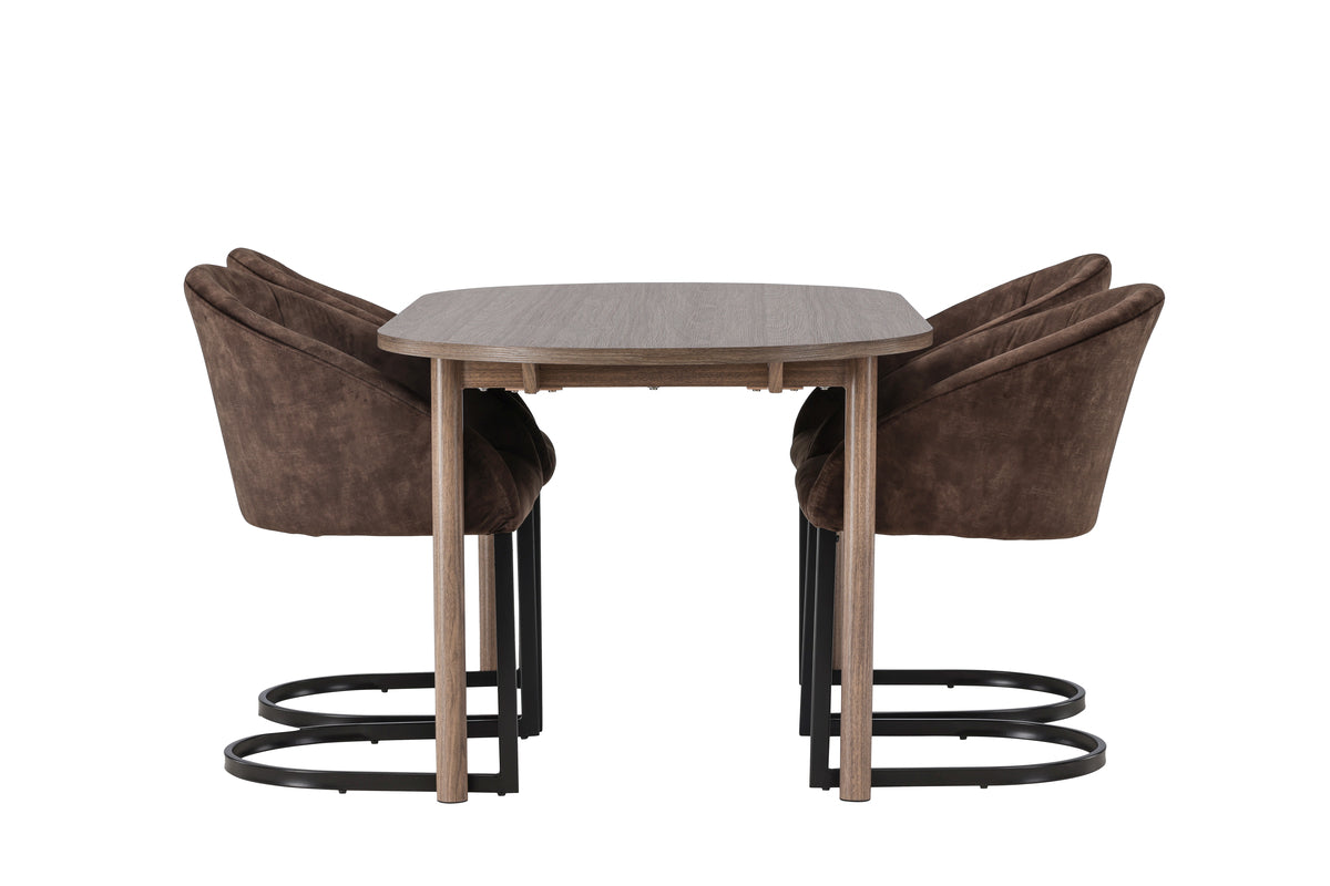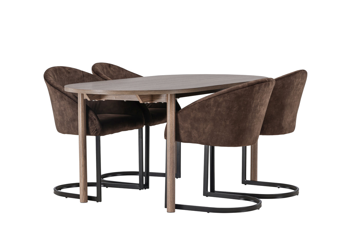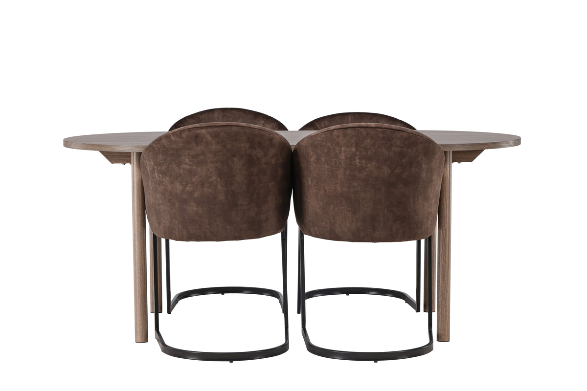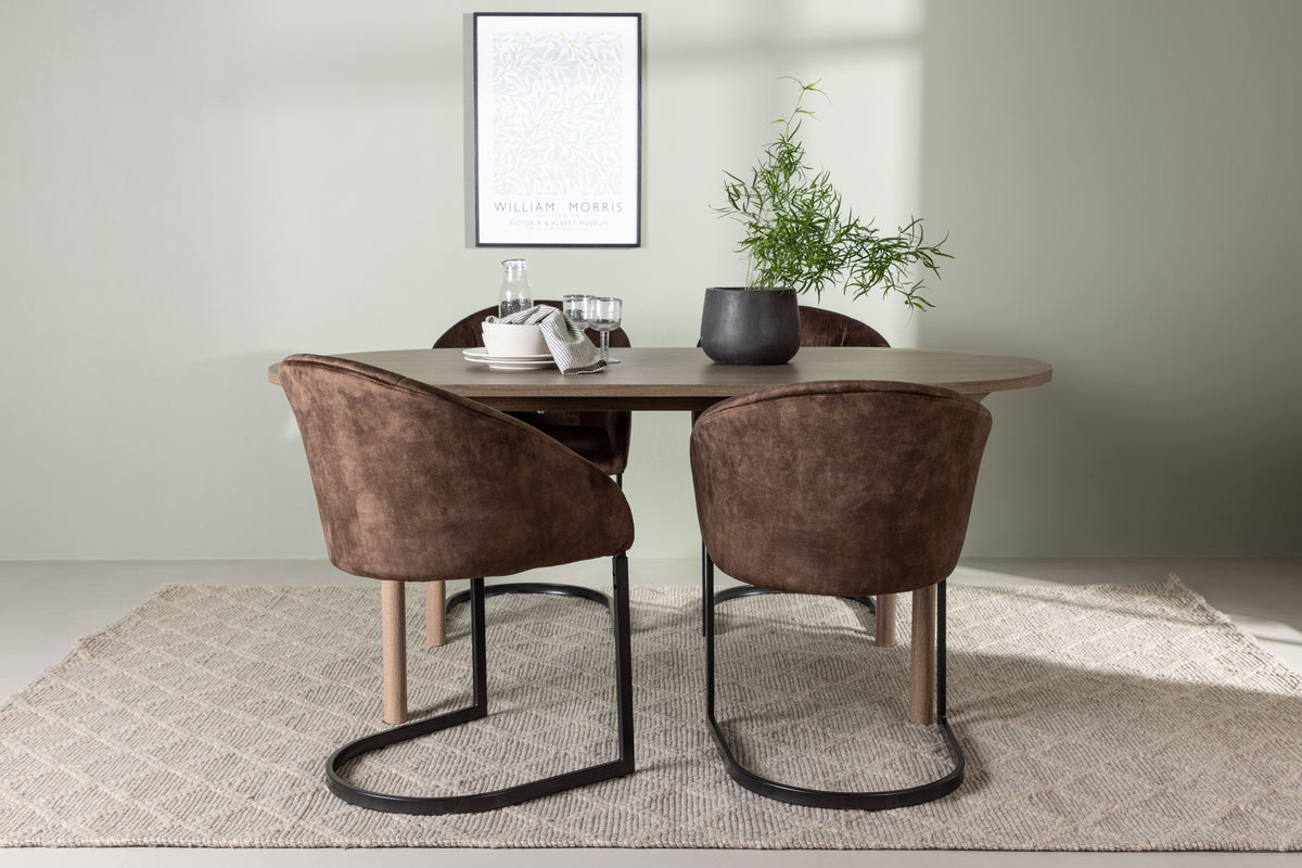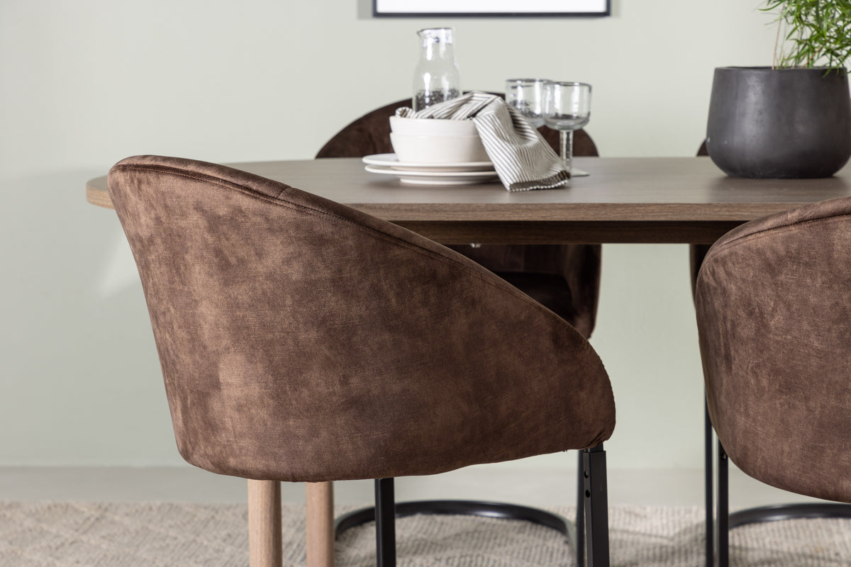 Tillsammans med 4 st bekväma matstolar Evening blir matgruppen komplett. Med sitt nostalgiska uttryck och stilrena design blir de en lyxig blickfångare runt ditt matbord. Stolarna har helklädda säten och mjuka, rundade ryggstöd i brunt tyg som ger extra komfort. Den minimalistiska benstommen i matt brunt stål ger en touch av modernitet och hållbarhet.