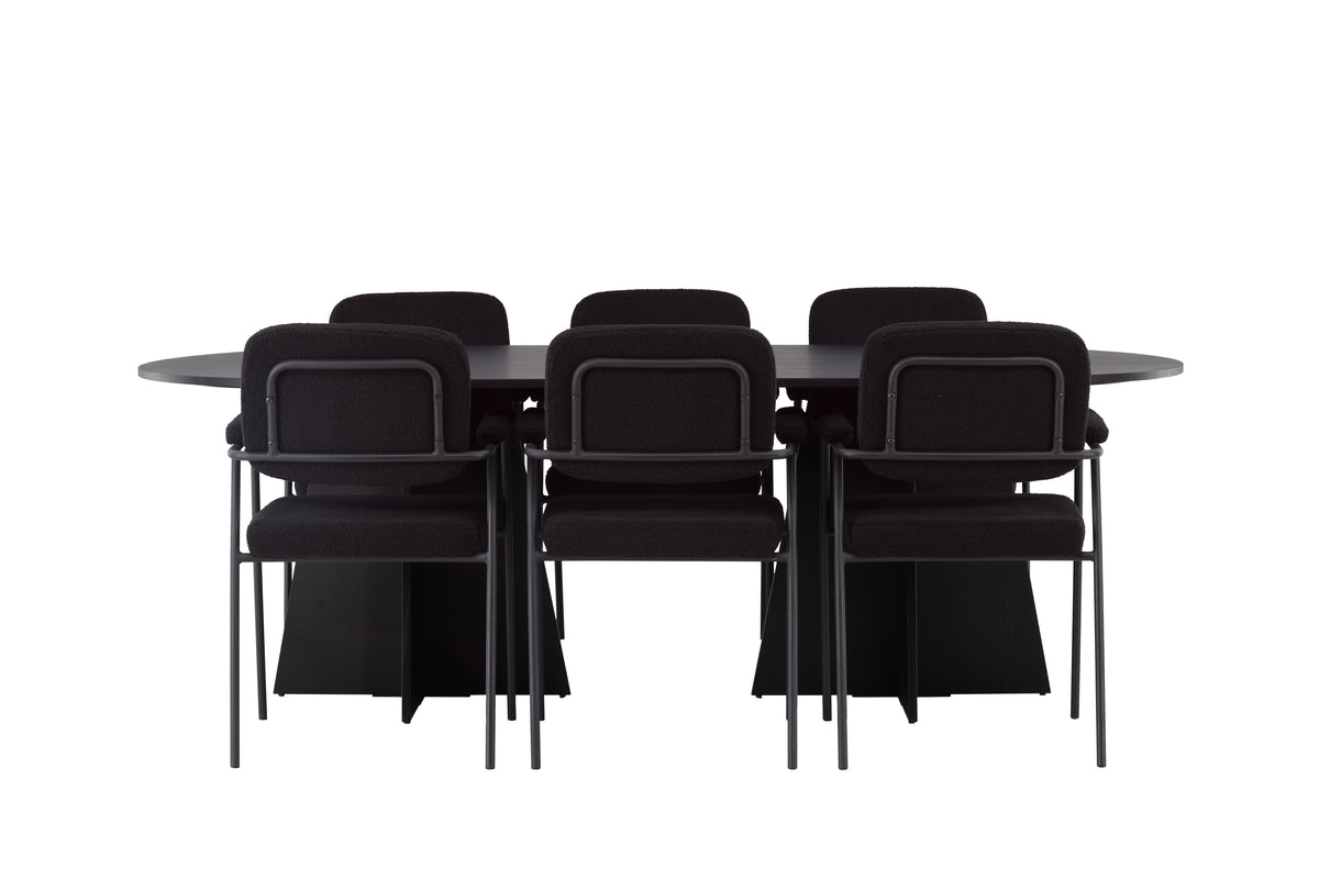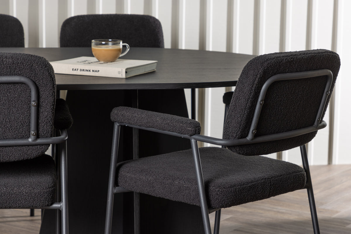 För att göra matgruppen komplett har vi här matchat med våra moderna matstolar från serien Yesterday. Stolarnas skandinaviska design och charmiga utseende kommer att imponera på både dig och dina gäster. Stolarna har en helklädd sits i svart bouclétyg som ger en touch av lyx och elegans till varje måltid. De smala stolsbenen med integrerade armstöd i svart metall ger en modern och snygg känsla.
