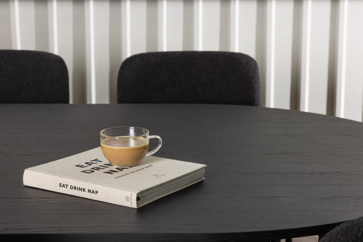 Det ska kännas lyxigt att komma hem till en god måltid. Här kombinerar vi den skandinaviska stilen med robusta former och stilrena kontraster! Det ovala matbordet Bootcut kommer att bli den perfekta mittpunkten i ditt vardagsrum. Den tunna och minimalistiska bordsskivan i svart MDF med faner skapar en smakfull kontrast till den robusta och säregna stommen med sina två konformade ben i en öppen design. Bordets mått: 115x230 cm.