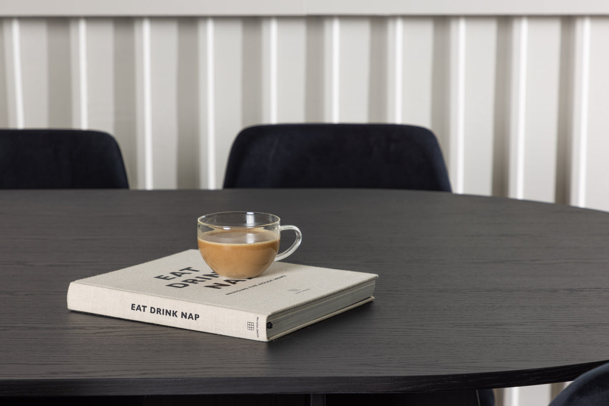 Här i perfekt kombination med svarta matstolar från serien Night. Med helklädd sits i sammetsmjukt svart tyg erbjuder Night matstolar en komfort som du gärna sitter kvar länge i under långa och härliga måltider. De matchande svarta stolsbenen ger en elegant och enhetlig estetik till hela blickfånget. Varje stol skapar därtill ett lyxigt skimmer i rummet och bidrar till en inbjudande atmosfär för dina gäster.