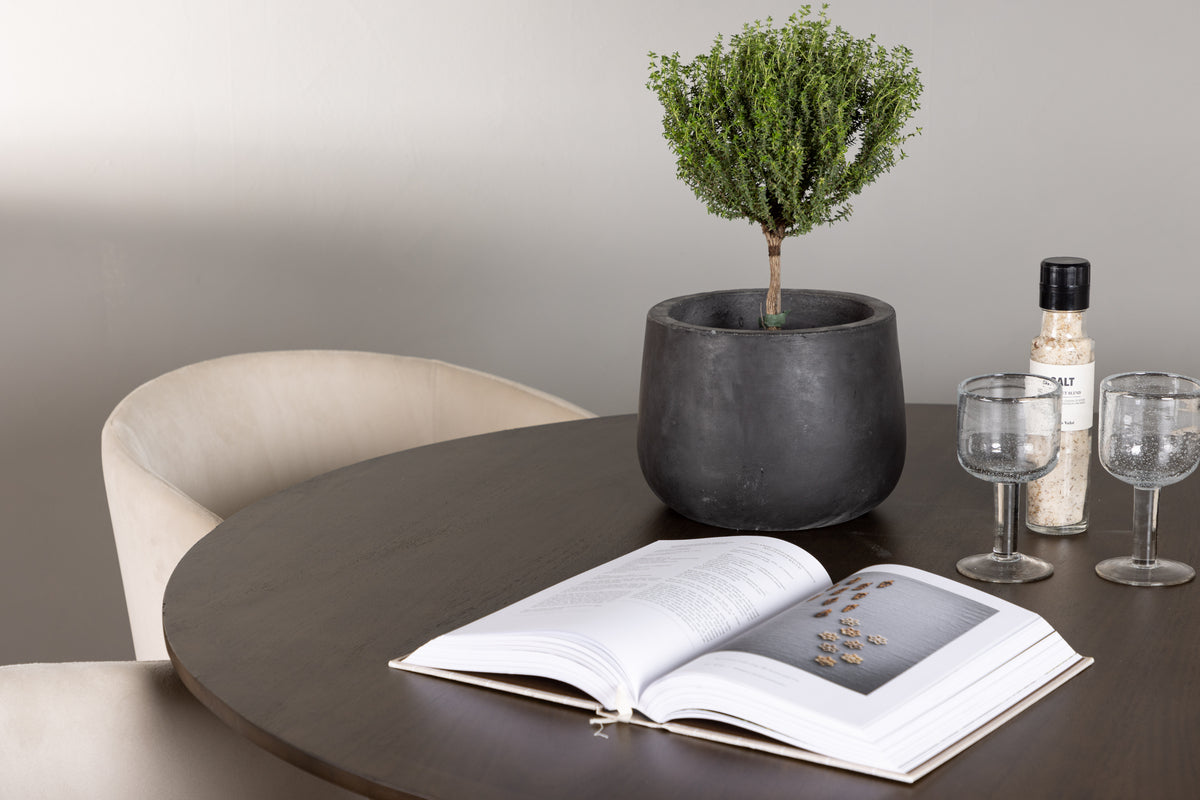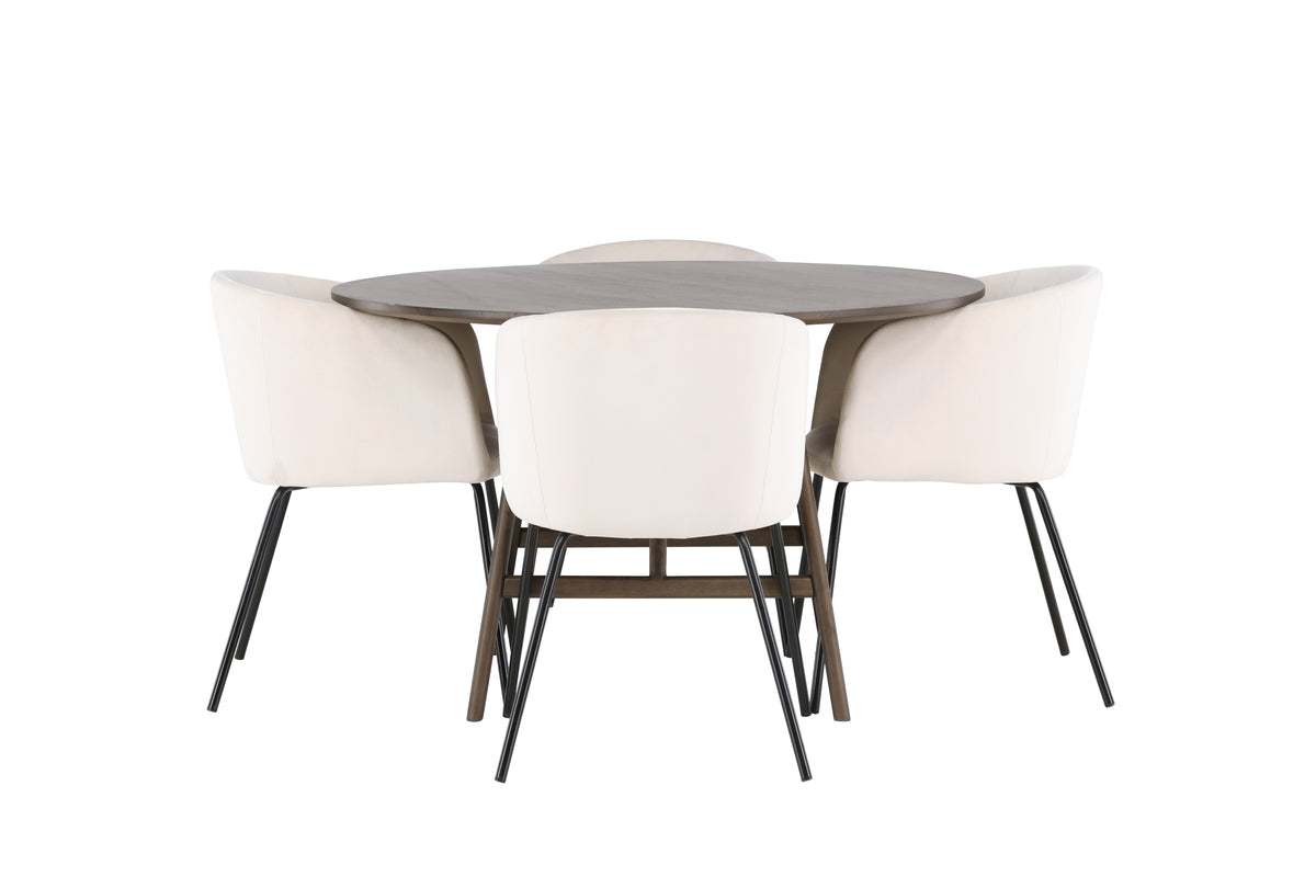 Vårt mörkbruna matbord Kaseidon har en klassisk design med en rund bordsskiva tillverkad av MDF. De lätt utsvängda bordsbenen i gummiträ ger bordet en stadig bas och den moderna valnötsfärgade kulören matchar perfekt det stilrena hemmet och blir ett stilfullt blickfång i vilket rum som helst.