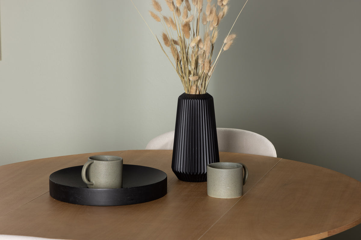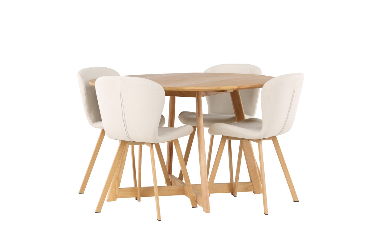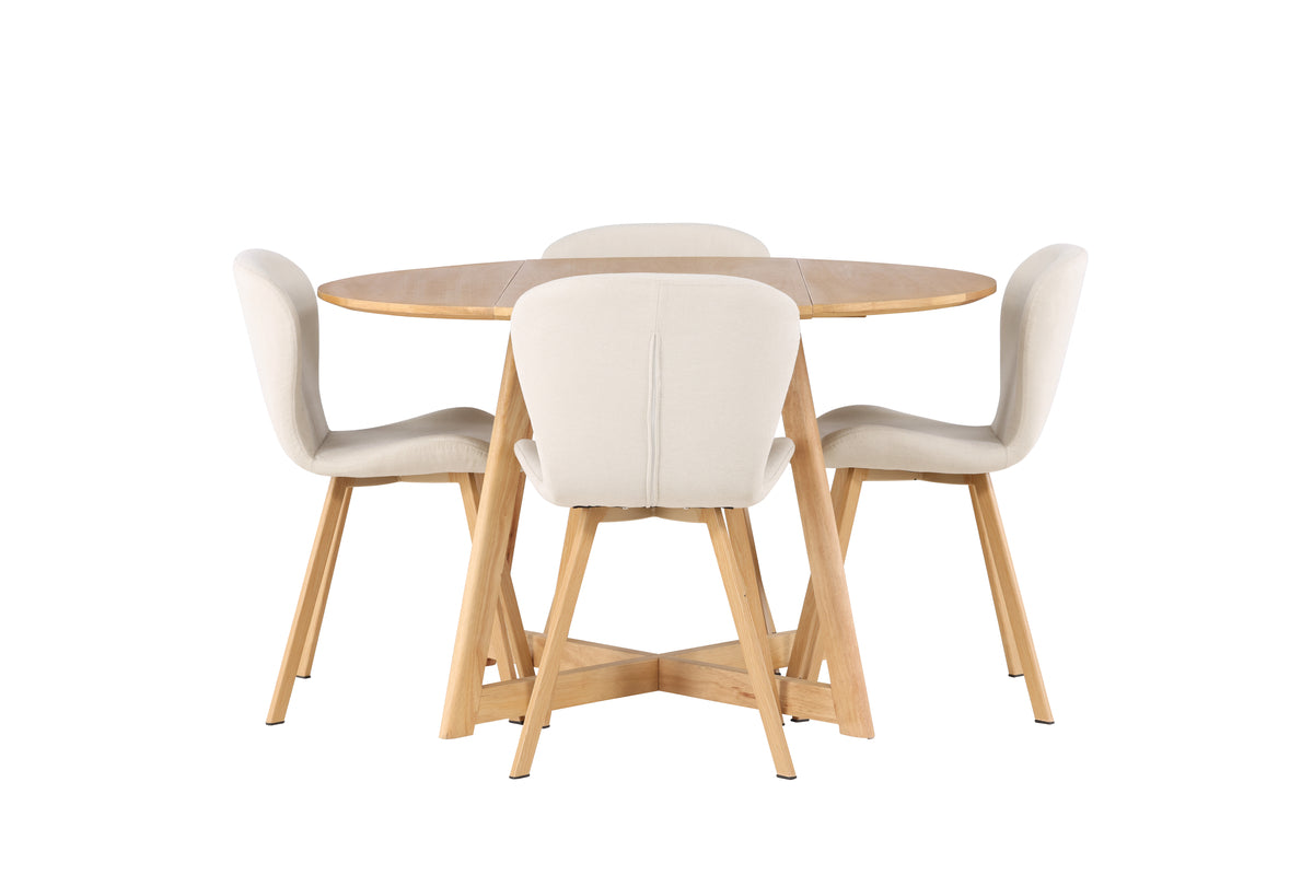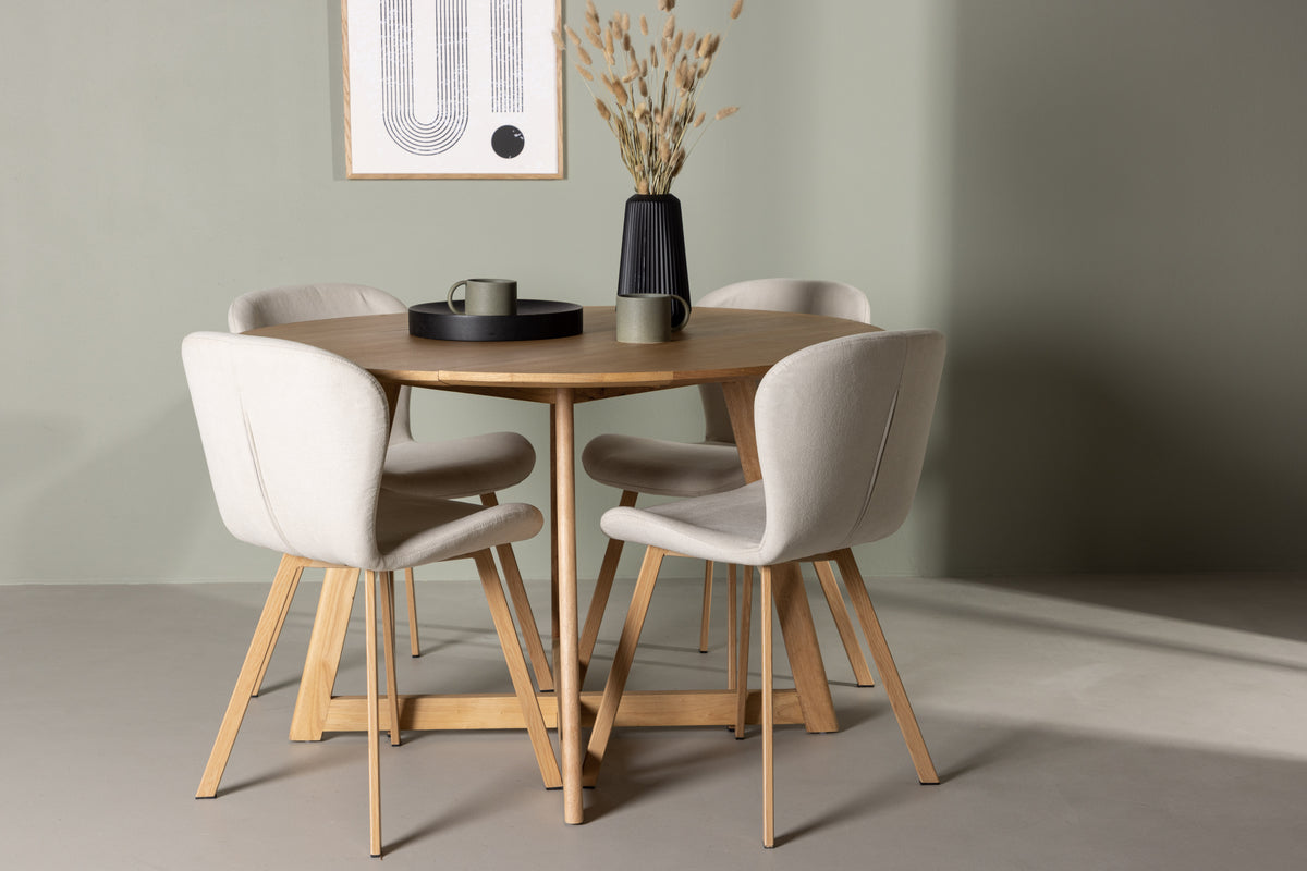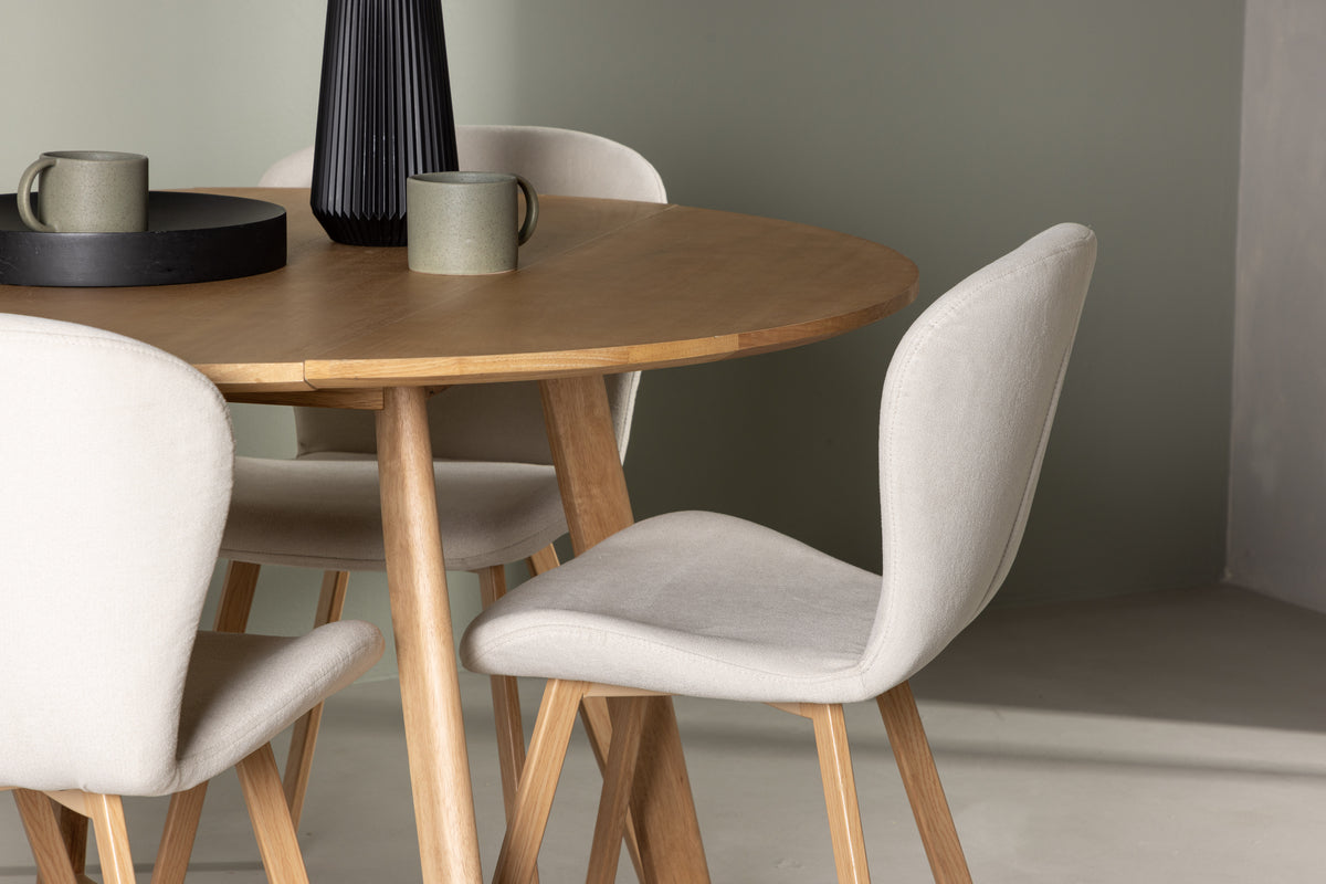 Här i perfekt match med 4 st hållbara matstolar från serien Lilja. Med en helklädd sits i beige polyestertyg bidrar stolen till ett diskret lyster som skiner upp i ditt hem. Den bekväma sittytan bjuder in till långa och njutbara måltider, medan de platta och lätt utsvängda stolsbenen i ekträ ger en stilfull bas som matchar bordet perfekt. Denna matgrupp erbjuder inte bara en genomtänkt helhet, utan också en känsla av lyx och tidlöshet. Kan det bli bättre än såhär?