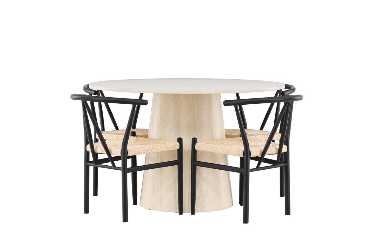 Matbordet Lanzo, tillverkat av vitvättad MDF, har en ljus och fräsch färg som tillför en ren och inbjudande atmosfär till ditt matrum. Med en generös diameter på 120 cm erbjuder bordet gott om plats för mat och samtal, samtidigt som dess runda form skapar en balanserad och social miljö. Bordets robusta konstruktion säkerställer långvarig användning och stabilitet.