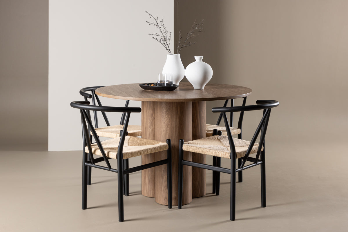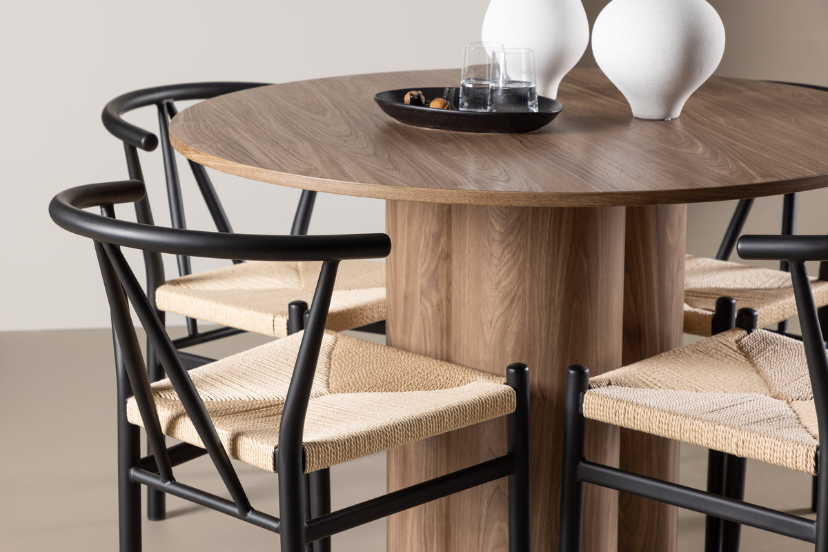 Stolarna Alfons kompletterar Olivia-bordet perfekt med sin unika design. Stolarna har en sits i beige rotting som erbjuder både komfort och stil. De svarta benen skapar en vacker kontrast till den naturliga rottingen och bordets mocca färg, vilket bidrar till en harmonisk och sofistikerad atmosfär i ditt matrum. Dessa stolar är designade med både estetik och ergonomi i åtanke, vilket gör dem bekväma att sitta på under långa middagar.