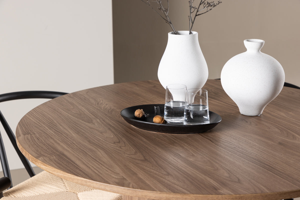 Bordet Olivia är ett smakfullt och tidlöst inslag i ditt hem. Med sin mocca färg och konstruktion i MDF ger bordet ett varmt och inbjudande intryck. Bordsskivan har en diameter på 110 cm, vilket gör det tillräckligt rymligt för att rymma fyra personer bekvämt, samtidigt som det är kompakt nog att passa i mindre utrymmen. Olivia-bordet står stabilt på sin solida bas och är lätt att rengöra, vilket gör det både praktiskt och elegant.