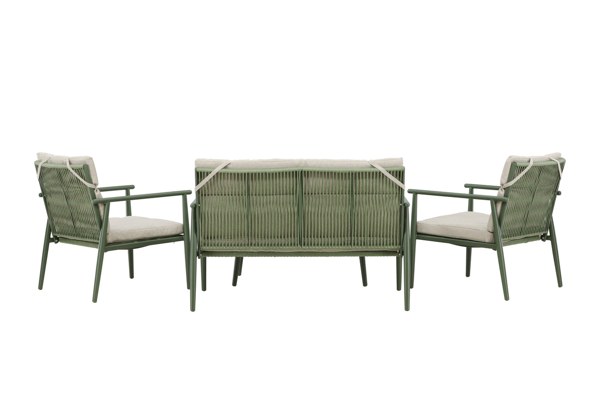 Mazzaro är soffgruppen som förenar stil och komfort för en harmonisk utomhusmiljö. Med en elegant och unik grön stålram blir denna grupp ett iögonfallande inslag på uteplatsen, samtidigt som den erbjuder en lätt och luftig design. Setet består av en soffa, två bekväma fåtöljer och ett litet rektangulärt bord – allt för att skapa den perfekta platsen att njuta av utomhuslivet med vänner och familj.